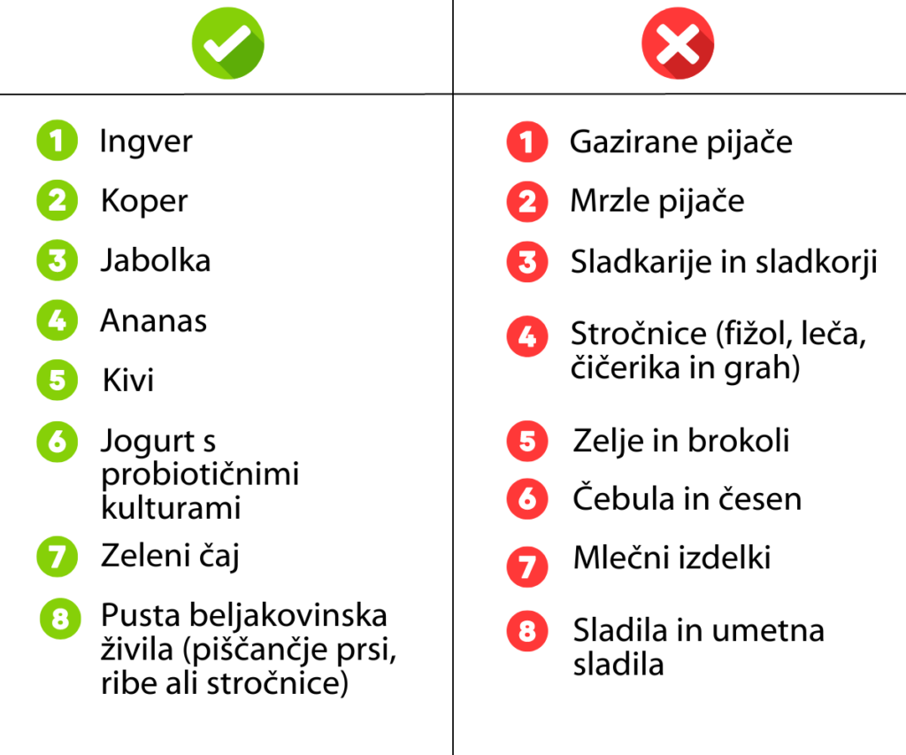 Izogibajte se hrani, ki povzroča napihnjenost, kot so stročnice, zelje, čebula, česen, gazirane pijače, sladkarije, kot so žvečilni gumiji in umetna sladila. Pri specialistih naredimo test za intoleranco na hrano in se hrane, ki nam povzročajo prebavne težave, izogibamo. To lahko naredimo tudi s t.i. izločanjem. To pomeni, da določeno vrsto hrane (npr. mleko in mlečne izdelke) izločimo iz našega jedilnika za cca. 2 tedna in ko gre to obdobje mimo, vrnemo jedilnik na staro stanje. Nato opazujemo naše počutje in sproti ugotavljamo katera hrana nam paše in katera ne. Hrano, ki nam povzroča napihnjenost, zaprtje ali drisko, izločimo iz našega jedilnika.