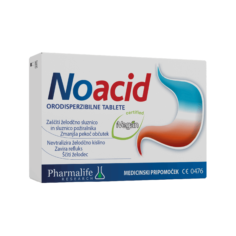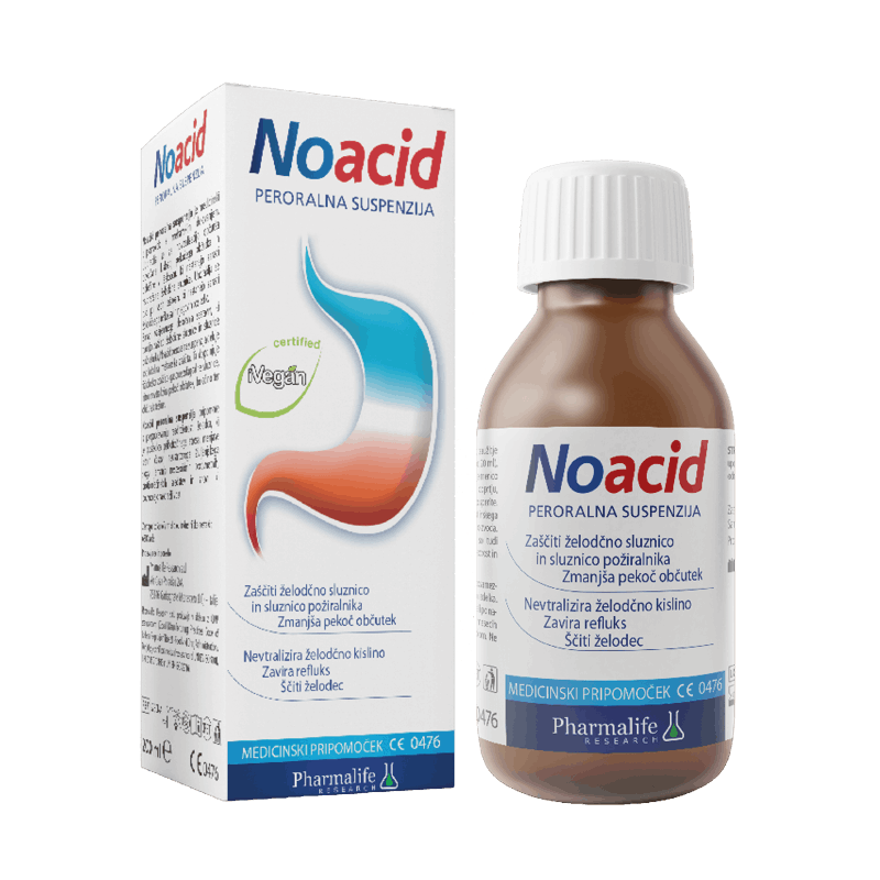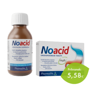 AKCIJA -20%Izvirna cena je bila: 27,88 €.22,30 €Trenutna cena je: 22,30 €. Dodaj v košarico30 orodisperzibilnih tablet | 200 ml suspenzijeMedicinski pripomočekPrihranek: 5,58 EUR. Idealna kombinacija naravnih rešitev za učinkovito in celovito lajšanje težav z zgago, refluksom in razdraženim želodcem. Paket Noacid Dvojček združuje Noacid peroralno suspenzijo (priročno za nočno uporabo) in Noacid orodisperzibilne tablete (priročno za dnevno uporabo). Delujeta hitro, nežno in brez znanih stranskih učinkov. Prijazen do želodca, saj ne posega v naravne želodčne procese.
